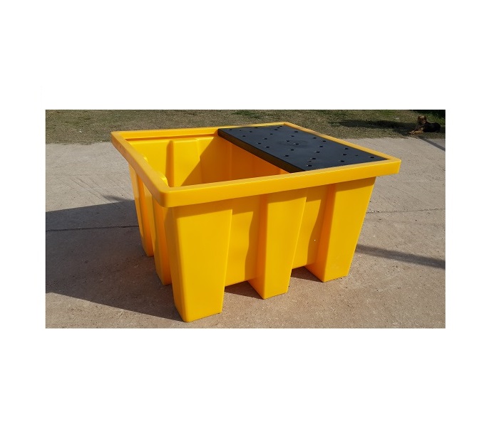 Solucion practica y economica para la contencion de derrames accidentales y de operacion de contenedores - Cubitainer, Bin, Maxibidon- hasta 1.000 L. Transportable mediante autoelevador. Apto para quimicos corrosivos, acidos, hidrocarburos, solventes, etc.